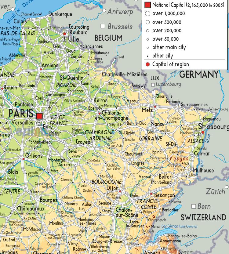 Carte de la France du nord-est. Carte du nord-est de la France (l'Europe de l'Ouest - Europe) à imprimer. Carte du nord-est de la France (l'Europe de l'Ouest - Europe) à télécharger. Le nord-est de la France n'est pas très connu en tant que région touristique, mais c'est une partie de la France qui vaut certainement la peine d'être considérée pour des vacances de courte durée depuis le sud-est de l'Angleterre ou la Belgique. Grâce au tunnel sous la Manche, tel qu'il est représenté sur la carte du Nord-Est de la France, vous pouvez quitter votre travail dans la région de Londres, échapper à la M25 et, deux à trois heures plus tard, vous retrouver dans la campagne vallonnée du département du Pas-de-Calais. Depuis Bruxelles, c'est encore plus proche.
